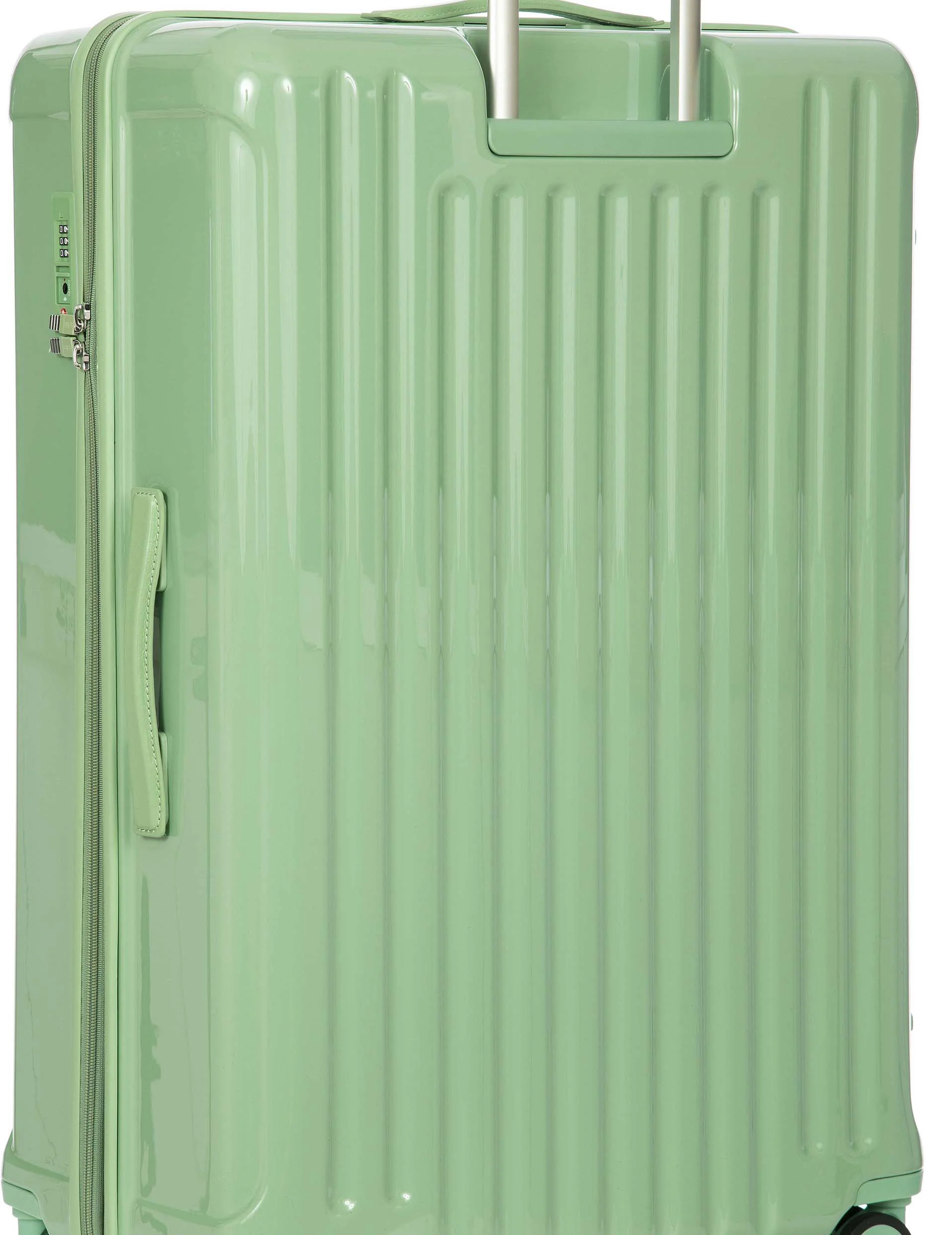 - EXTERIOR: flexible and durable recycled polycarbonate shell with leather details. Zipper with a TSA combination luggage lock built into the shell. The expandable zipper increases the trolley's depth by 4 cm.
