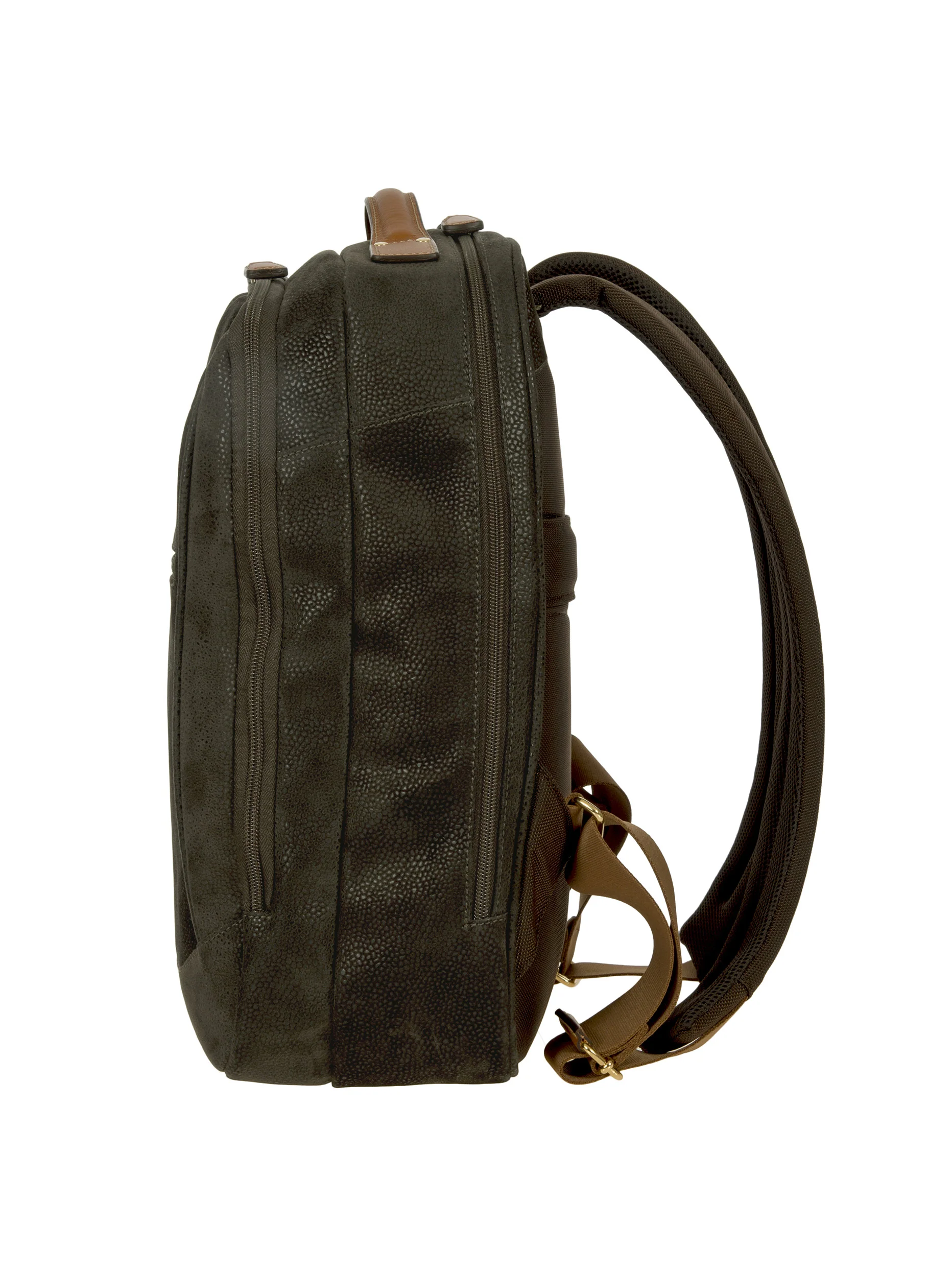 Modern with a compact shape, making it perfect for around the city and practical for travelling, this laptop backpack from Bric's Life Collection has been designed for the man that requires efficiency and elegance. It is made entirely in Bric's characteristic suede look material and is durable and easy to clean and features vegetable tanned Tuscan leather finishes. A good use of space has been made to best organise your documents, laptop and personal items, so that you can carry them with care. EXTERIOR: zipped pocket on the front for placing your most used items; comes with two compartments with double zip closure; top handle for ease of use when carried by hand; comfortable, padded shoulder straps. INTERIOR: the first compartment includes a zipped pocket and a large compartment with an inner key holder in leather; the second includes a compartment with a Velcro fastening, where you can conveniently place a laptop and iPad in two separate pockets. DETAILS: key holder included on the interior.