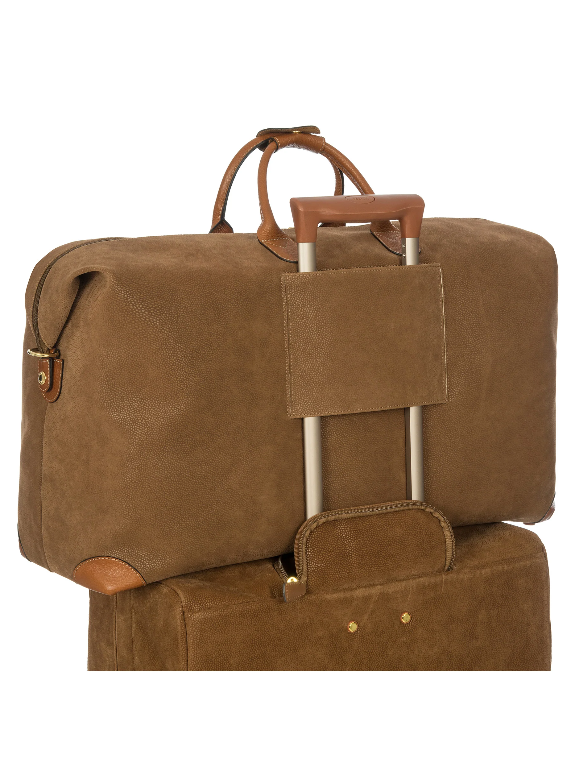 Designed and made in Italy, this large duffle bag from the Life collection is constructed in Bric’s iconic suede-effect material. Water-resistant and extra durable, it’s the product of expert artisan production processes. Everyday use will give it a vintage look, making it even more unique. A detachable, adjustable-length strap is included, making it easy to carry over the shoulder. The posterior side has a band that easily slips over the handle of the suitcase. The main compartment is opened by a double-slide zip. Its roomy shape makes it particularly ideal for travel, complete with inner pockets (one with a zip) and an outer zip pocket so that essential items are always to hand. The handles and details in real leather, a distinctive Bric’s accent, make it even more refined.