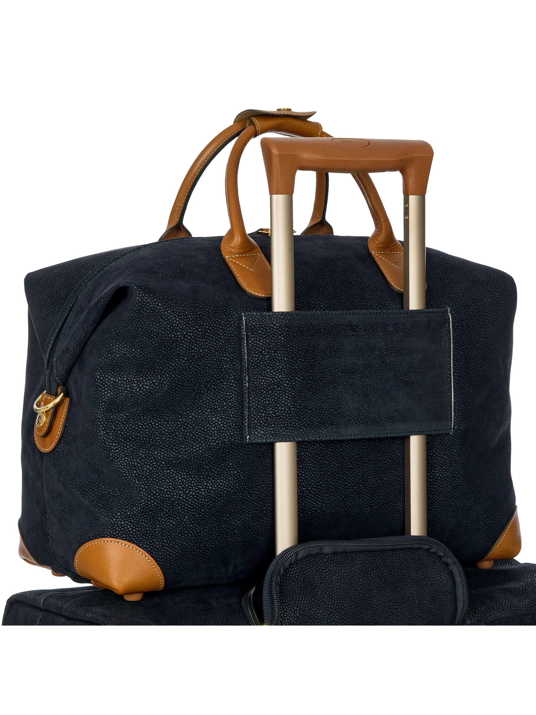 Designed and made in Italy, this small duffle bag from the Life collection is made with Bricās iconic suede-effect material. Water-resistant and extra durable, itās the product of expert artisan production processes. Everyday use will give it a vintage look, making it even more unique. A detachable, adjustable-length strap is included, making it easy to carry over the shoulder. The posterior side has a band that easily slips over the handle of the suitcase. The main compartment is opened by a double-slide zip. Its roomy yet compact design makes it particularly versatile, complete with inner pockets (one with a zip) and an outer zip pocket so that essential items are always to hand. The handles and details in real leather, a distinctive Bricās accent, make it even more refined.
