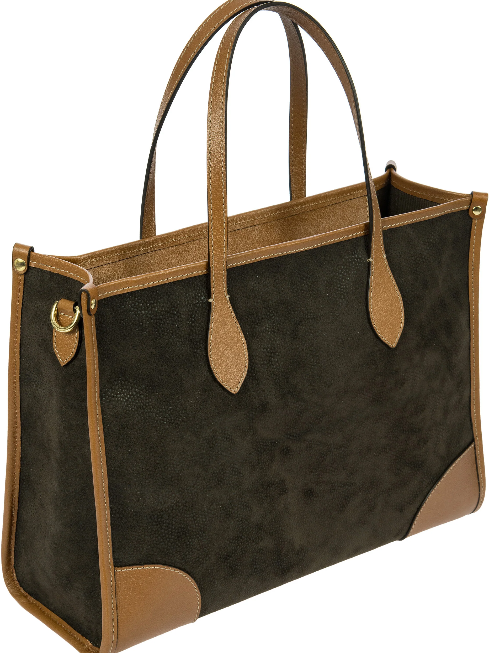 Designed and manufactured in Italy, the Life Collection Opera Bag is your go-to bag, 24/7. Reinforced bottom, tablet compartment and small pockets. This bag combines capacity and essential lines. Safe zipped fastening, double soft-leather handle and removable shoulder strap. Expertly hand-crafted design, with Bricās iconic water-proof suede-effect material. The interior is finished with a fabric lining. The exterior is embellished by real leather edges.